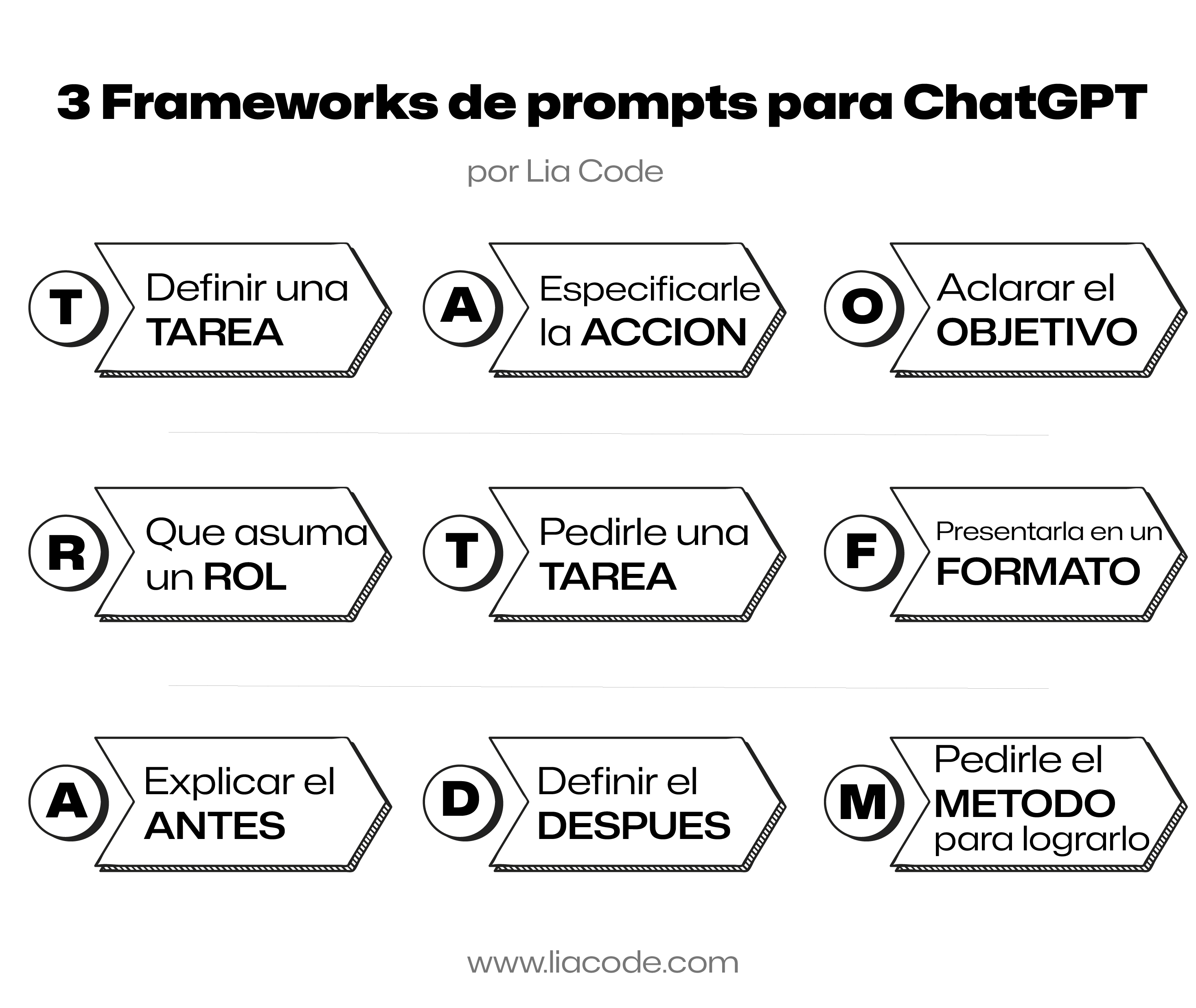 R-T-F (Rol-Tarea-Formato): Este marco implica asumir un rol específico para crear una tarea y presentarla en un formato particular.